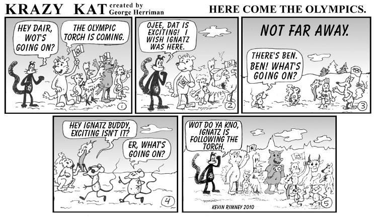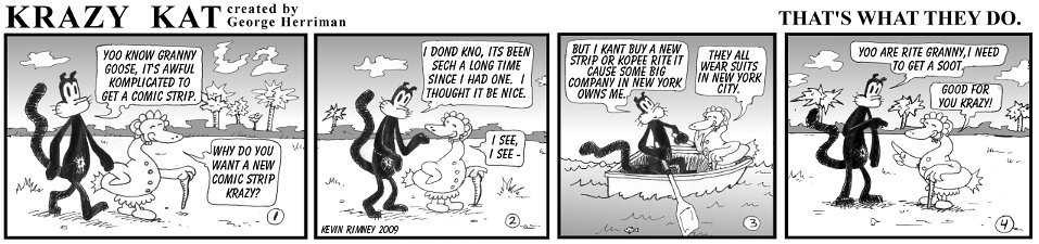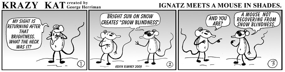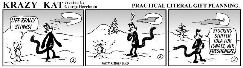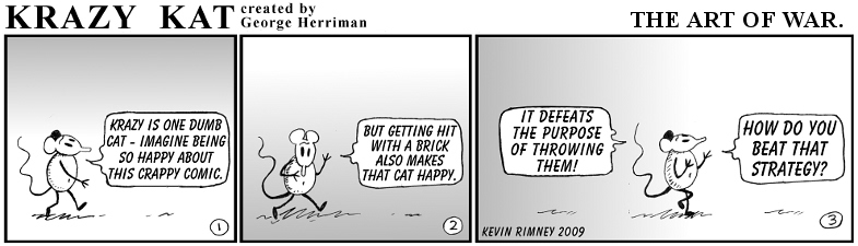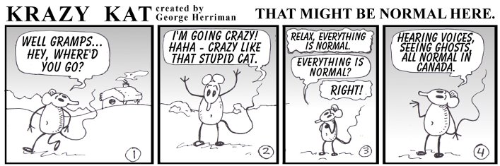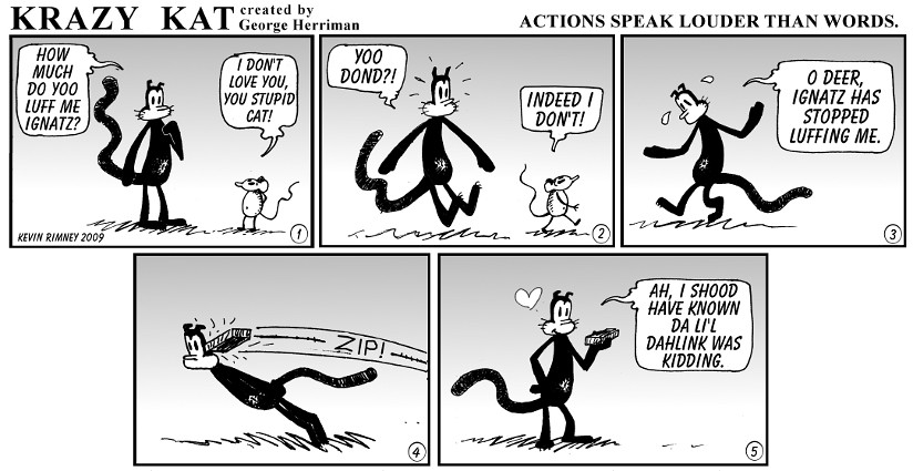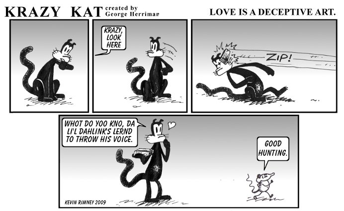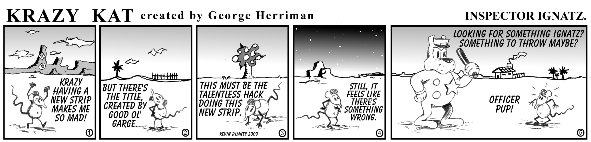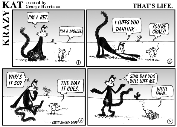 Krazy Kat (also known as Krazy & Ignatz in some reprints and compilations) is an American newspaper comic strip, by cartoonist George Herriman, which ran from 1913 to 1944. It first appeared in the New York Evening Journal, whose owner, William Randolph Hearst, was a major booster for the strip throughout its run. The characters had been introduced previously in a side strip with Herriman's earlier creation, The Dingbat Family. The phrase "Krazy Kat" originated there, said by the mouse by way of describing the cat. Set in a dreamlike portrayal of Herriman's vacation home of Coconino County, Arizona, Krazy Kat's mixture of offbeat surrealism, innocent playfulness and poetic, idiosyncratic language has made it a favorite of comics aficionados and art critics for more than 80 years.